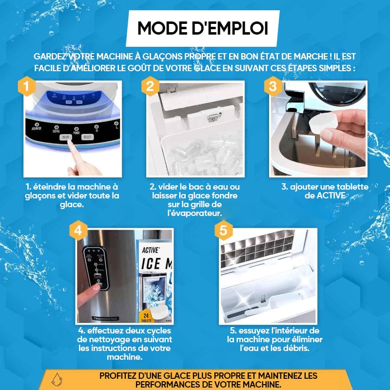 ❄️ Éliminer les odeurs et améliorer le goût des glaçons : La fonction de désodorisation pendant le processus de nettoyage permet d'éliminer les odeurs, garantissant un goût plus pur et plus frais des glaçons.