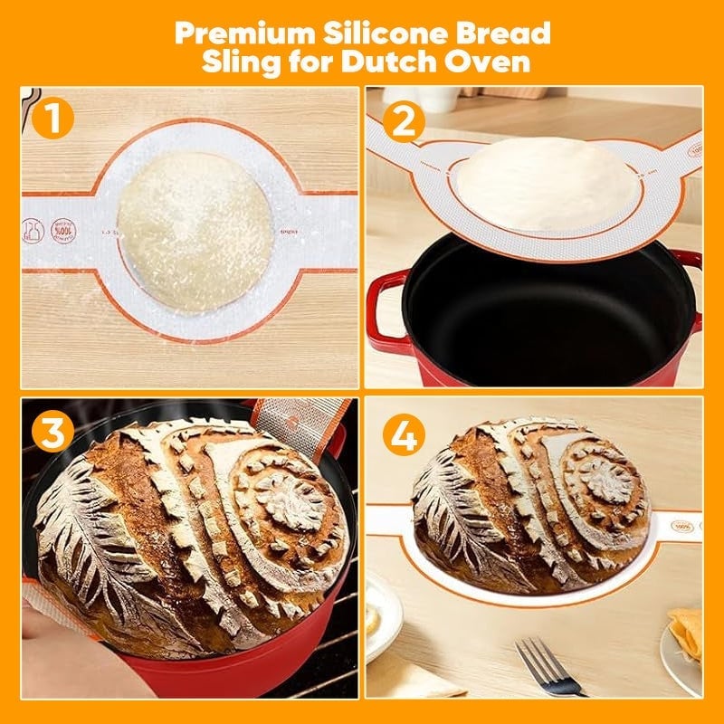 Sangle antiadhésive pour cocotte : La sangle en silicone de qualité alimentaire résiste aux hautes températures, évite l'adhérence et dispose de longues poignées pour un soulèvement sûr et facile lors de la cuisson dans une cocotte.